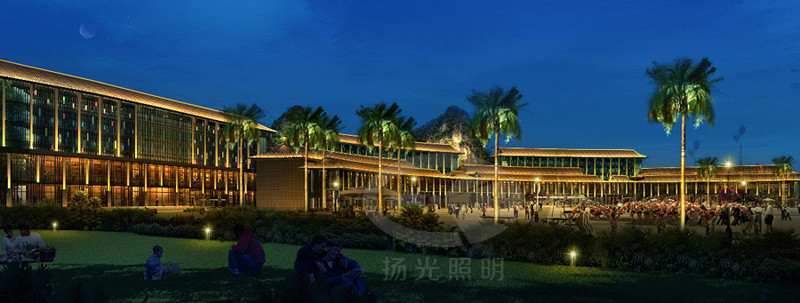 廣場商業(yè)街、宿舍位于項(xiàng)目中心位置,是人流聚集點(diǎn),夜間為亮度最高區(qū)域。運(yùn)用燈具大面積洗亮建筑頂部,使其成為區(qū)域內(nèi)的視覺焦點(diǎn)。吸引人群聚集于此。
