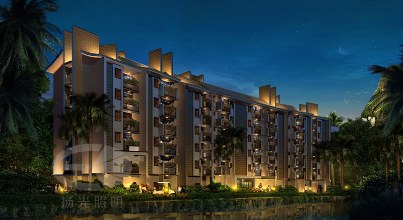 住宅燈光以靜謐的燈光氛圍為主,充分結(jié)合建筑特色,運(yùn)用“點(diǎn)線面”燈光手法,強(qiáng)調(diào)建筑夜景特色。重點(diǎn)交代建筑頂部與入口在夜間的主次關(guān)系。